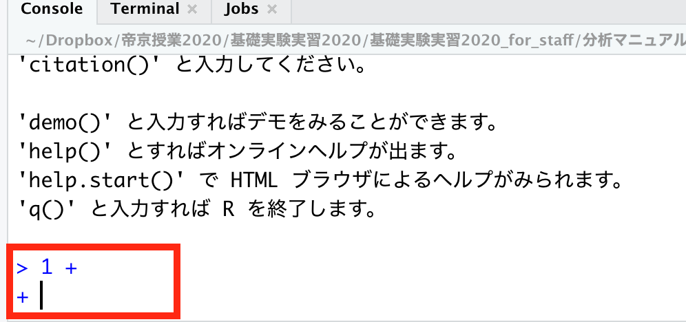 と中途半端な状態で入力したので、Rはプログラムの続きがあるものと思って入力を待っている状態にある。プログラムの続きを入力すれば、結果が出力される。例えばこの例ならば、1