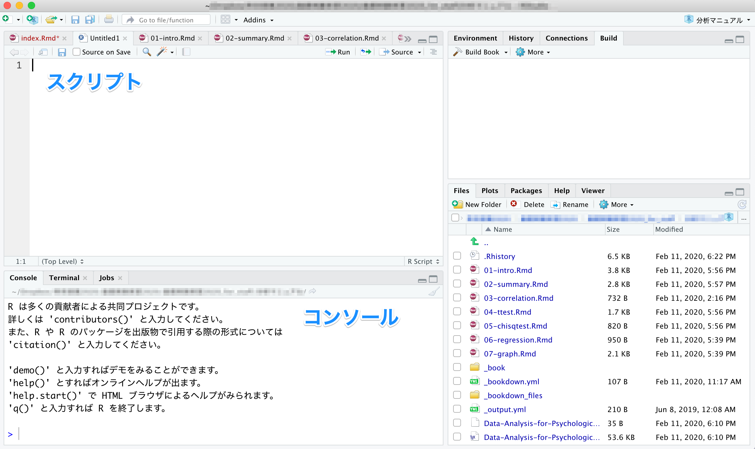 R に限らず、ファイルやフォルダ名に全角文字が含まれていると障害になる場合がある。ファイル名やフォルダ名には、なるべく日本語(全角文字)は使わない習慣を身に着けよう。