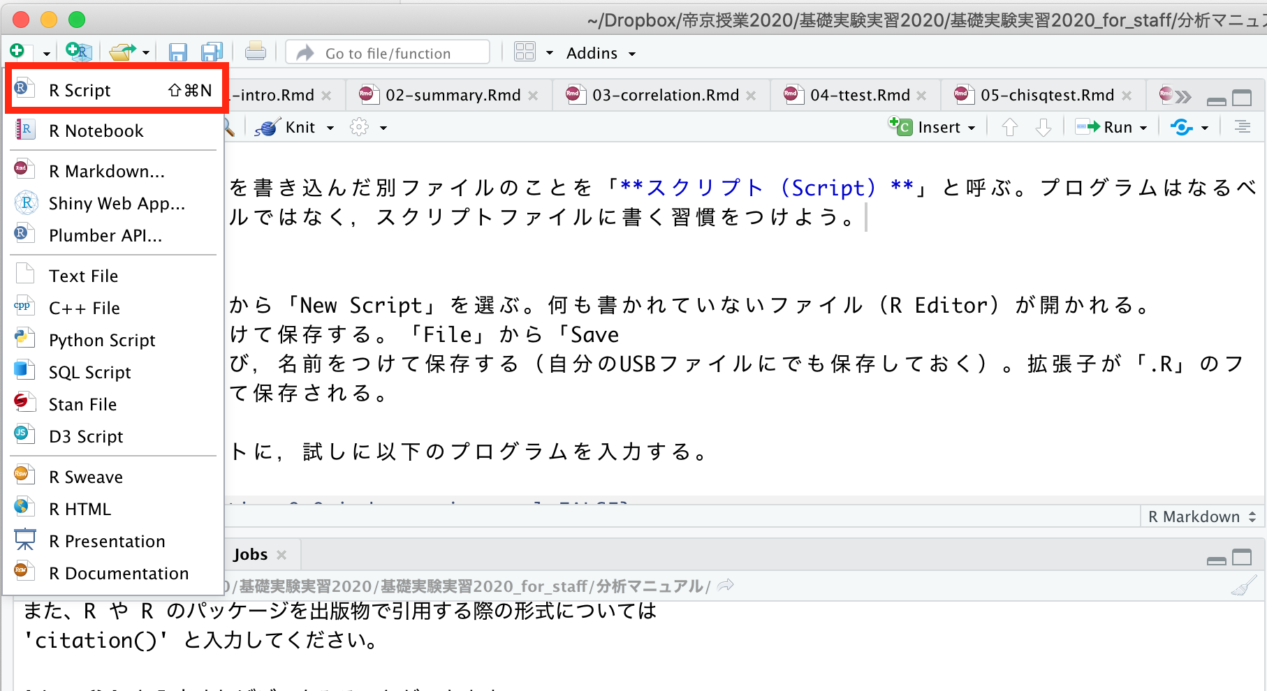 スクリプトファイルを開きたいときは、RStudio を立ち上げて、「File」から「Open File」を選び、スクリプトのファイルを選ぶ。