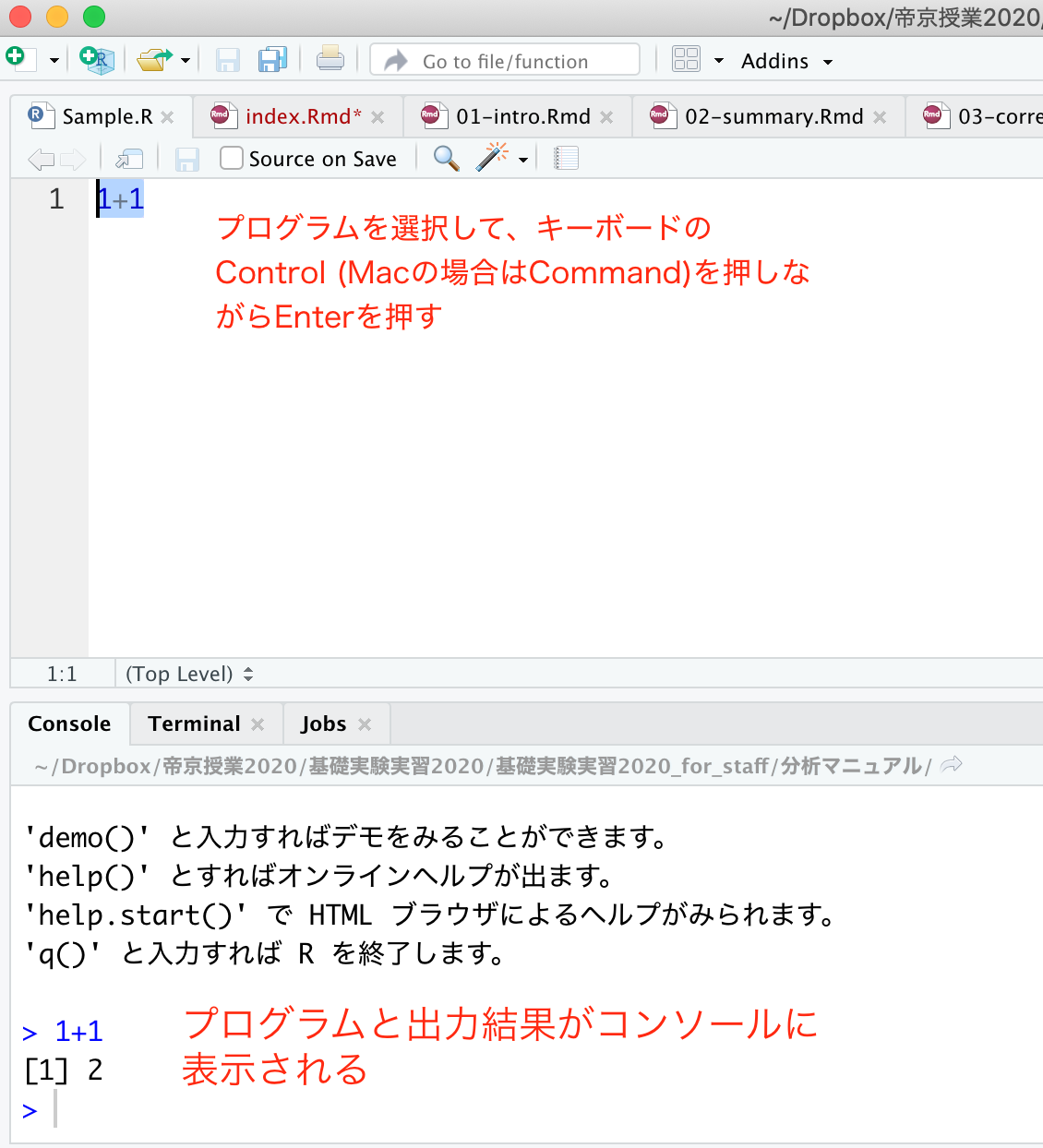 コンソールに入力したプログラムや出力結果は、R を閉じると消えてしまう。これでは復習できないので、プログラムは別のファイルに残しておいた方が良い。