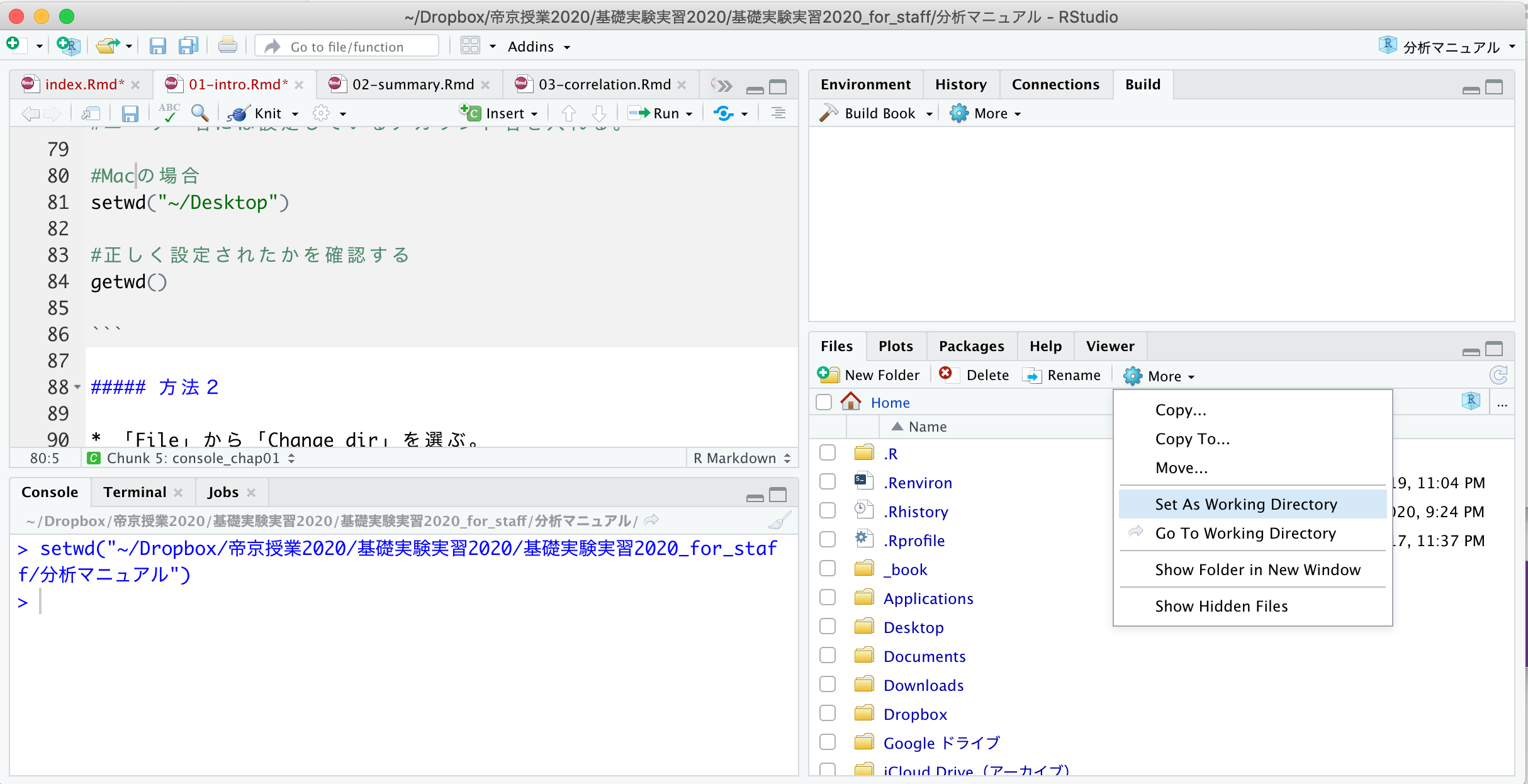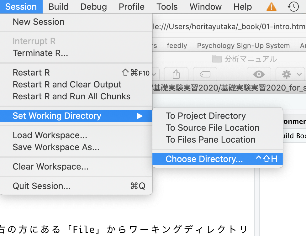 データを読み込む前に、ワーキングディレクトリ (Working directory)について理解する必要がある。ワーキングディレクトリとは、「現在居る場所」のことである。ファイルを読み込む際には、Rにデータがどこに有るかを教える必要がある。Rはワーキングディレクトリを起点にして、読み込むファイルを探す。