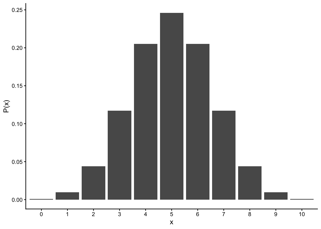 plot = data.frame(x=0:10, p=dbinom(x=0:10, size=10, prob=0.5))