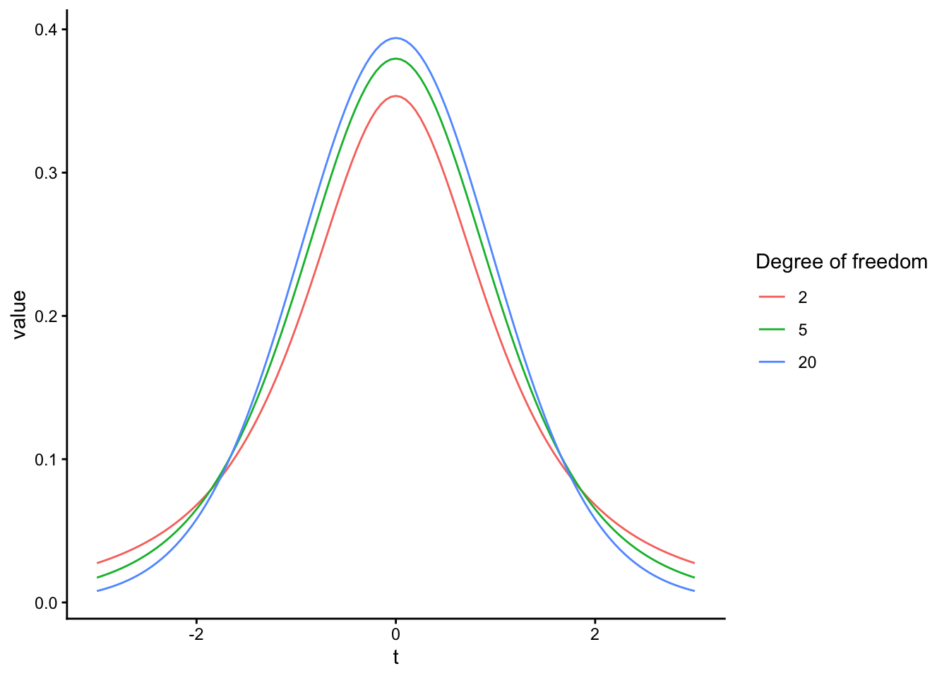 ggplot2::labs(x = "t", y = "value", color = "Degree of freedom") +