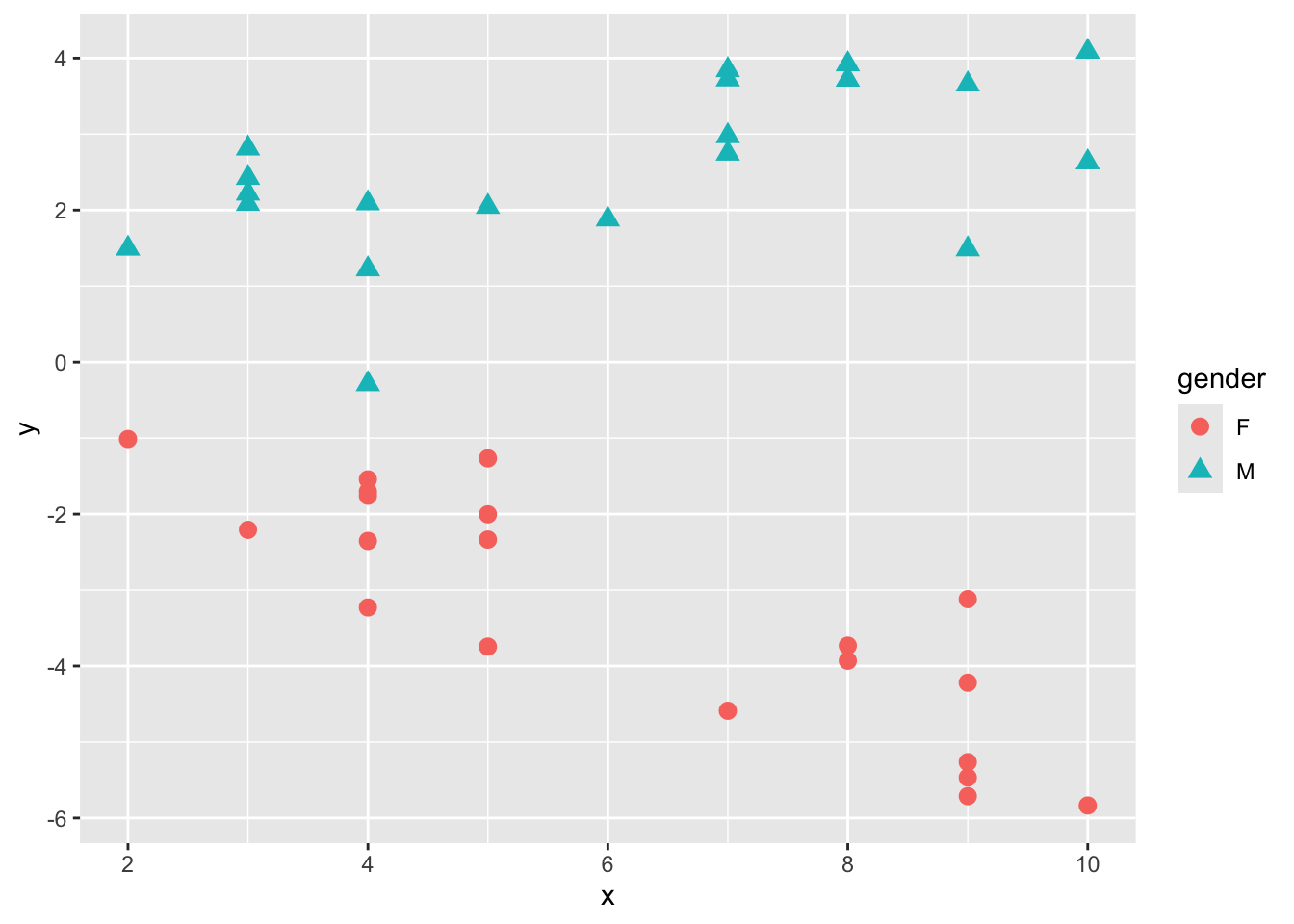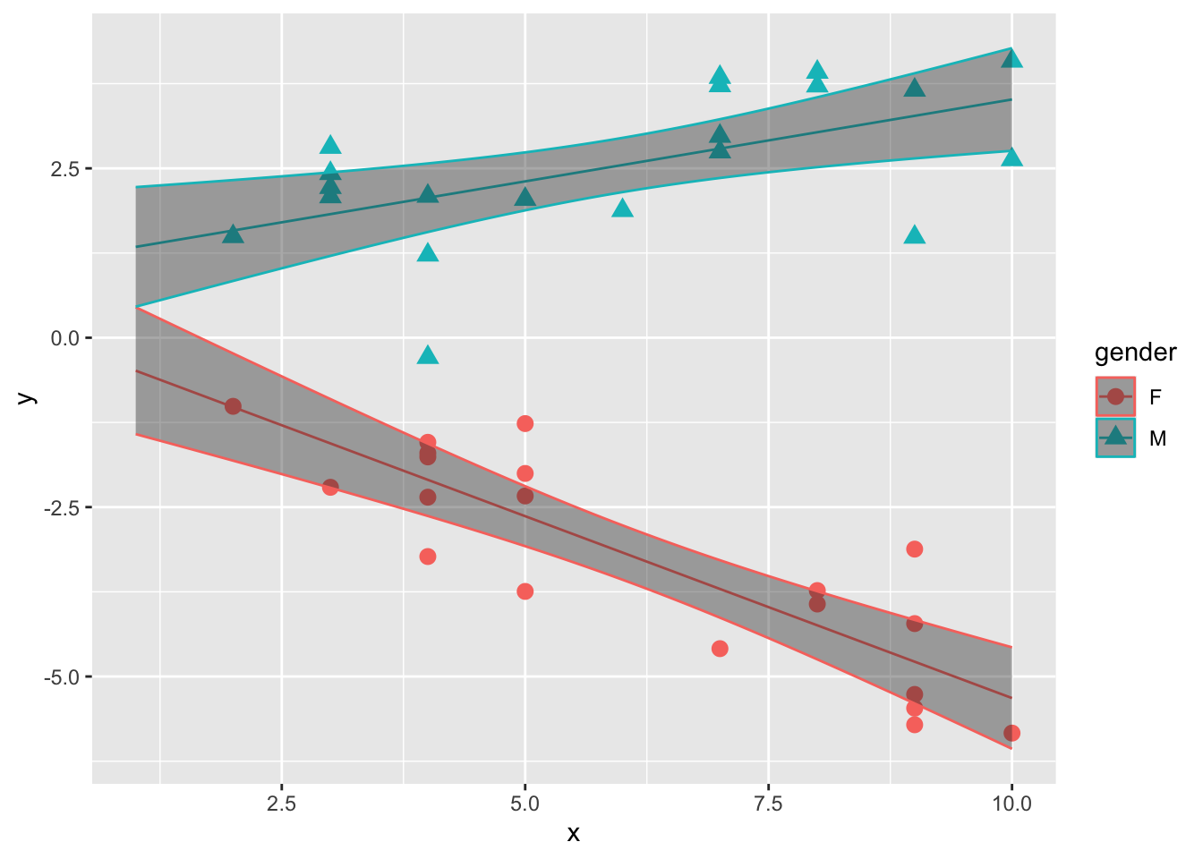 では単純傾斜の比較もすることができる(男性と女性で傾きが有意に異なるか?)。この結果は、線形モデルの推定結果に表示される交互作用項の検定の結果と一致する(交互作用の傾きが意味するのは「調整変数が1であるときに、予測変数の傾きがどのくらい変化するか」であり、その増え方がゼロより有意に大きいあるいは小さいかを検定している)。