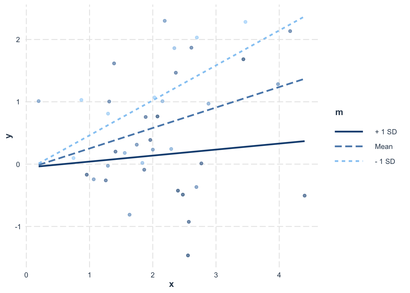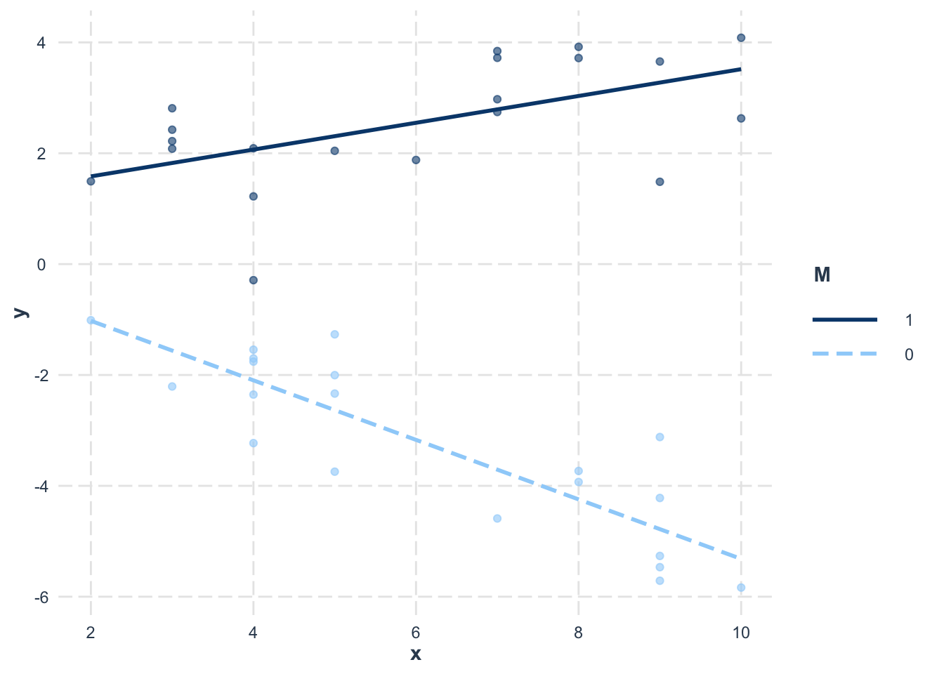 \[ \hat{y} = \alpha + \beta_{1} x + \beta_{2} m + \beta_{3} x m \\ \]