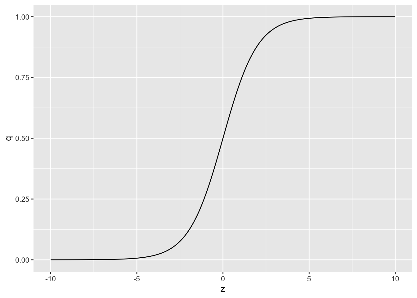 \(z\)は\(-\infty\)から\(\infty\)の範囲を取るが、\(z\)がどのような値をとっても、\(0<q<1\)となる(限りなく0もしくは1に近づく)。\(q\)は確率なので、この0から1の範囲に収まるようになる変換は都合が良い。