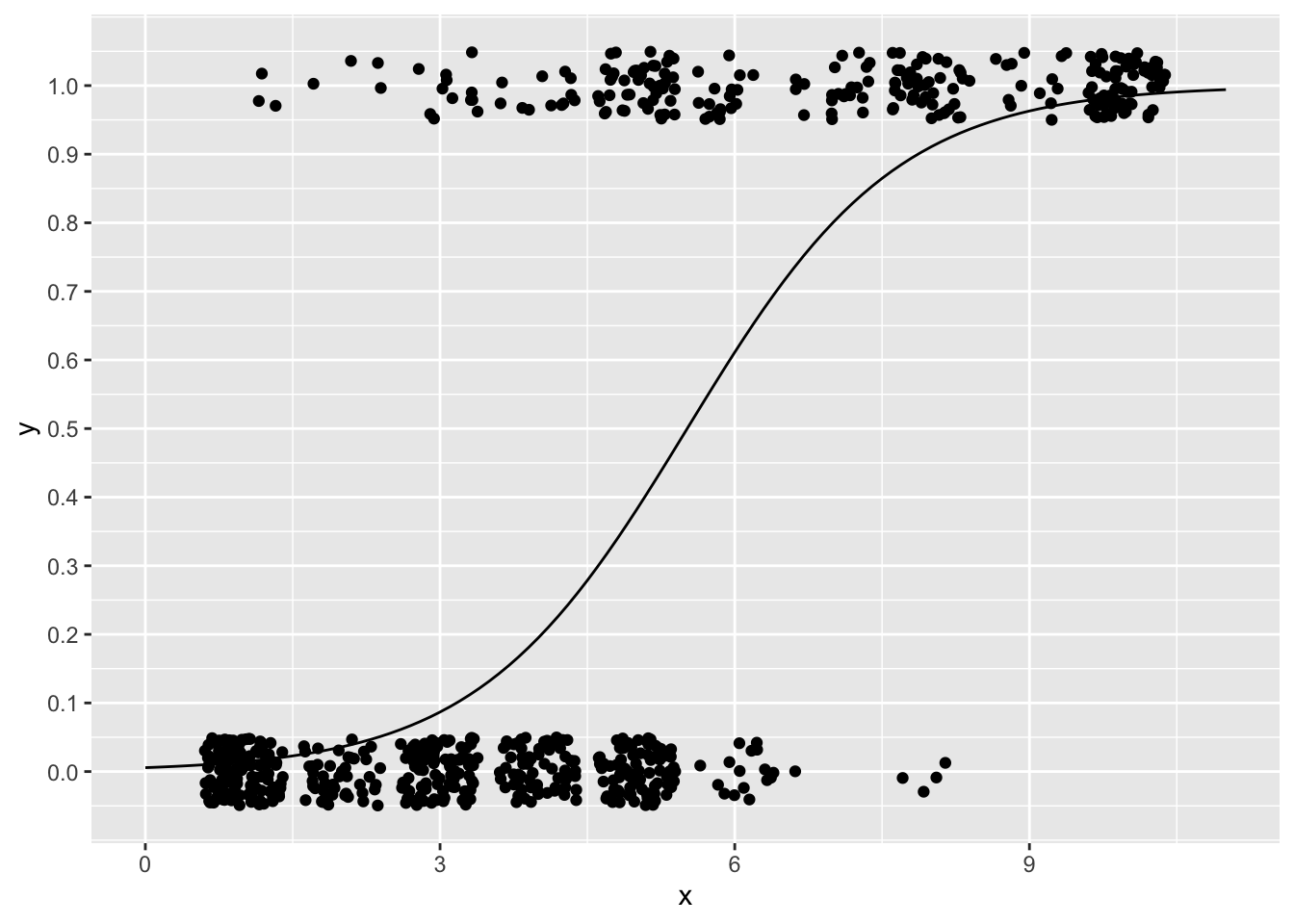 ## glm(formula = y ~ 1 + x, family = binomial(link = "logit"), data = dat)