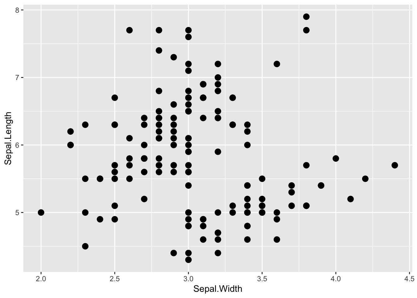 ggplot2::geom_point(data=iris, aes(x=Sepal.Width, y=Sepal.Length),size = 3)