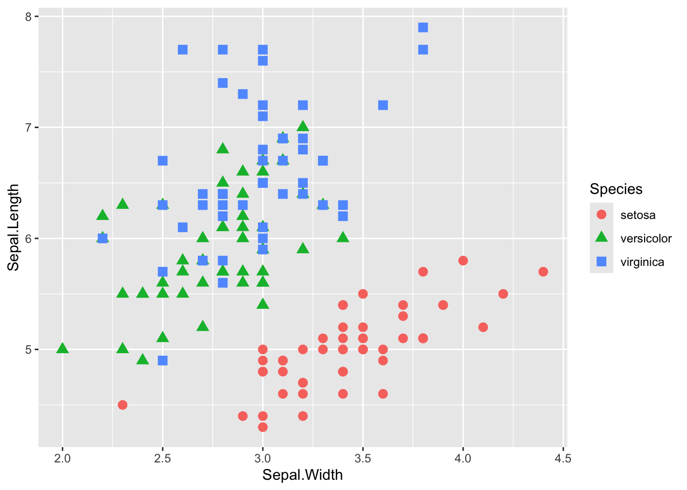 ggplot2::geom_point(data = iris, aes(x = Sepal.Width, y = Sepal.Length, color = Species, shape = Species), size = 3)