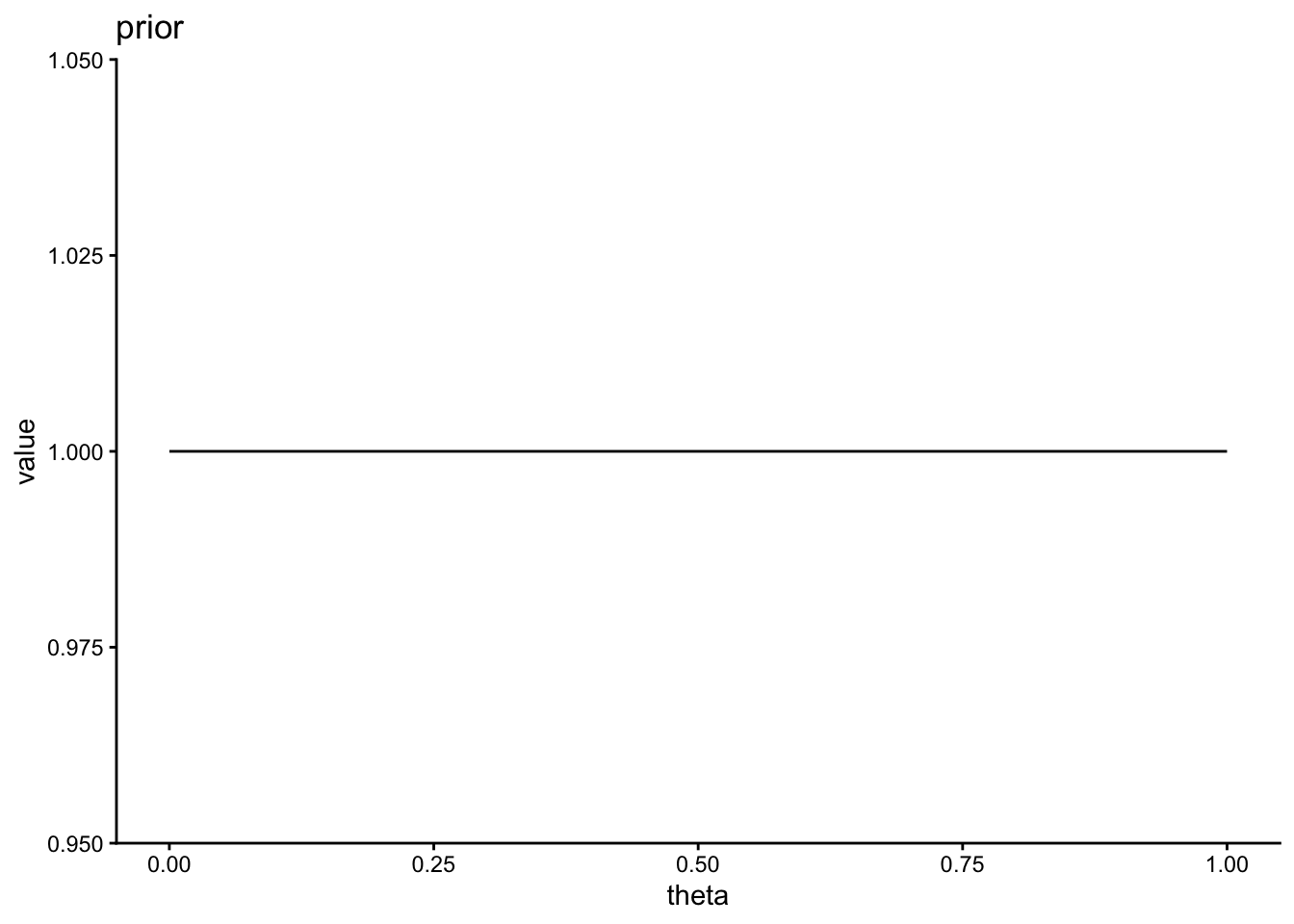 この例では、表が出る確率\(\theta\)の事前分布を0から1の範囲の連続一様分布に設定する。連続一様分布は確率密度関数なので、縦軸は確率そのものを意味しないので注意(面積が確率を意味する。0から1までの範囲の面積が1となっている)。