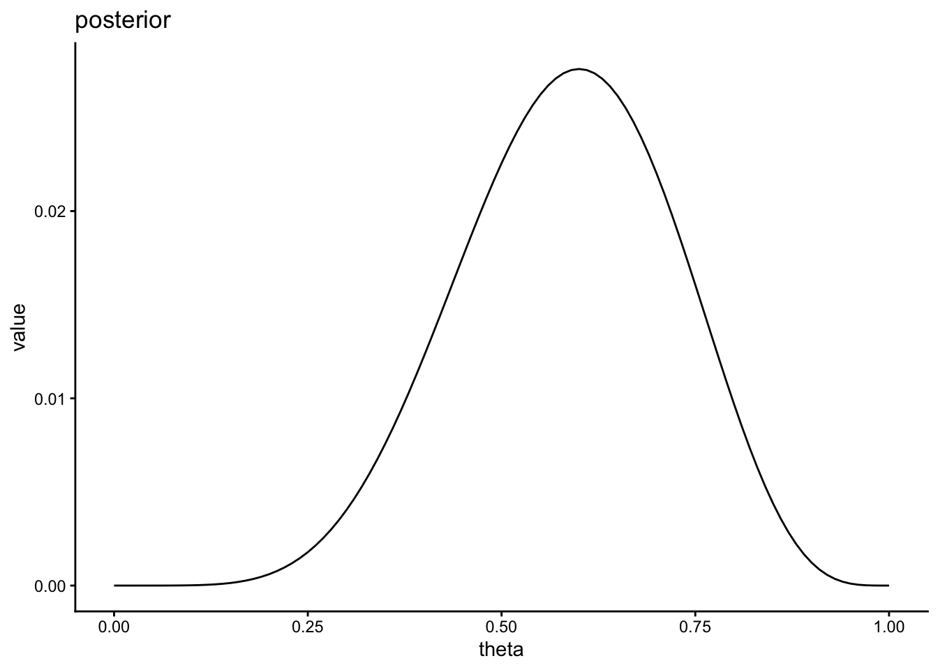 手元にゆがんだコインがあるとする。このコインの表が出る確率は不明なので、何回かコインを投げて推定することにする。このコインを10回投げたら、6回表が出た。このデータから、コインの表が出る確率\(\theta\)の事後分布を推定しよう。