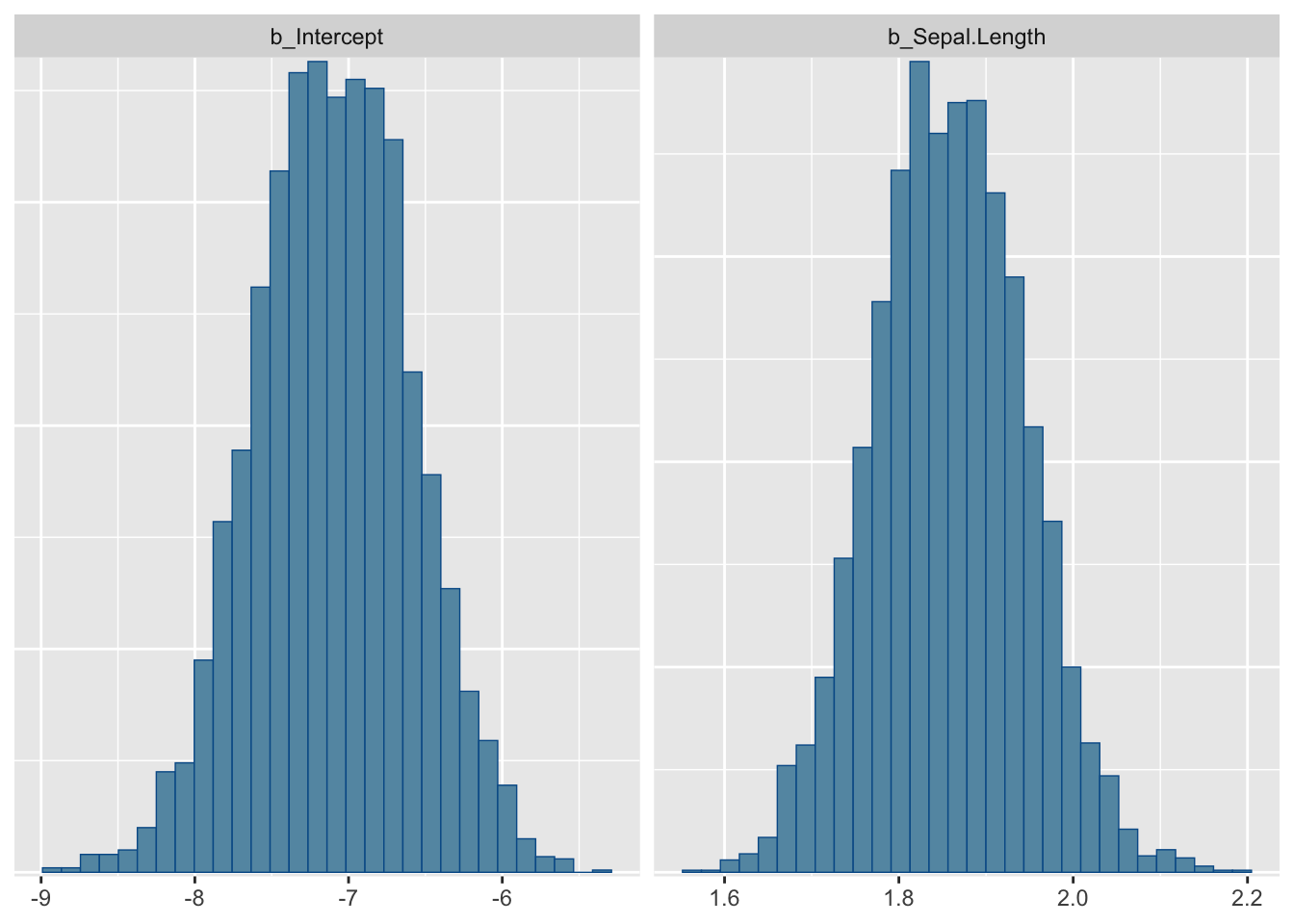 )の事後分布のプロットを確認すると、だいたい-7が分布の中央に位置しており、推定された切片の事後分布の期待値(Estimate)と概ね一致しているのがわかる。また、-8から-6の範囲に事後分布の大部分が締めており、これも95%信用区間の推定結果と概ね一致している。