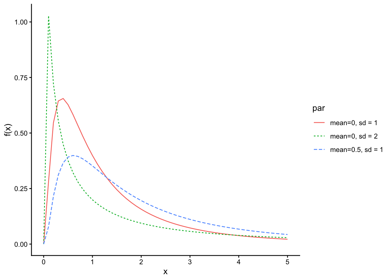 lnorm_2 = data.frame(x=seq(0,5, 0.1), f = dlnorm(seq(0, 5, 0.1), meanlog = 0.5, sdlog = 1), par = "mean=0.5, sd = 1")