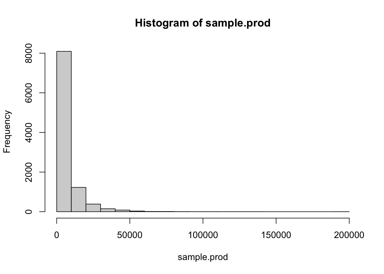 sample.prod = sapply(c(1:10000), function(x) {prod(round(runif(n = 7,min = 1,max = 6),0))} ) #prod()はカッコ内のベクトルの要素をかけ合わせる関数