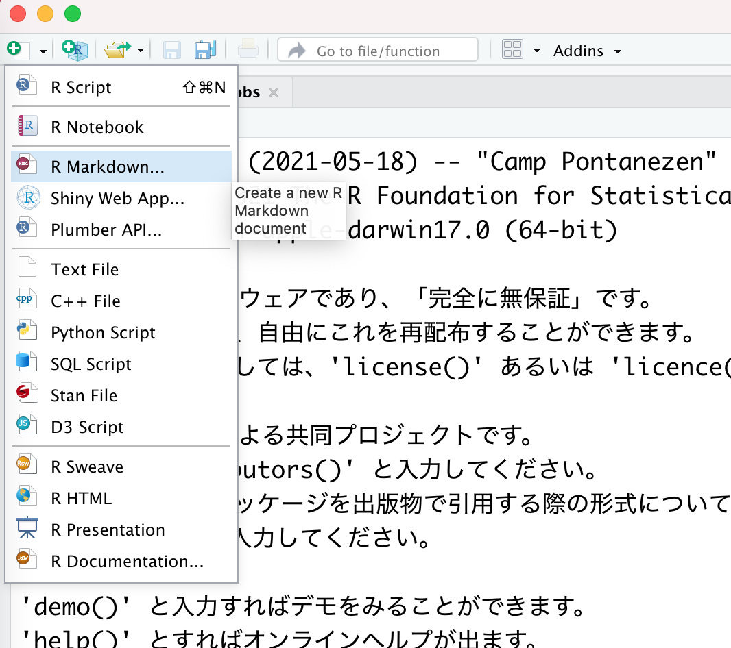RStudioならば、R Markdownの機能を使うことで、自分が行った分析のコードや出力をドキュメント形式で残しておくことができて便利である。 以下に、R Markdownの簡単な使い方について示す。