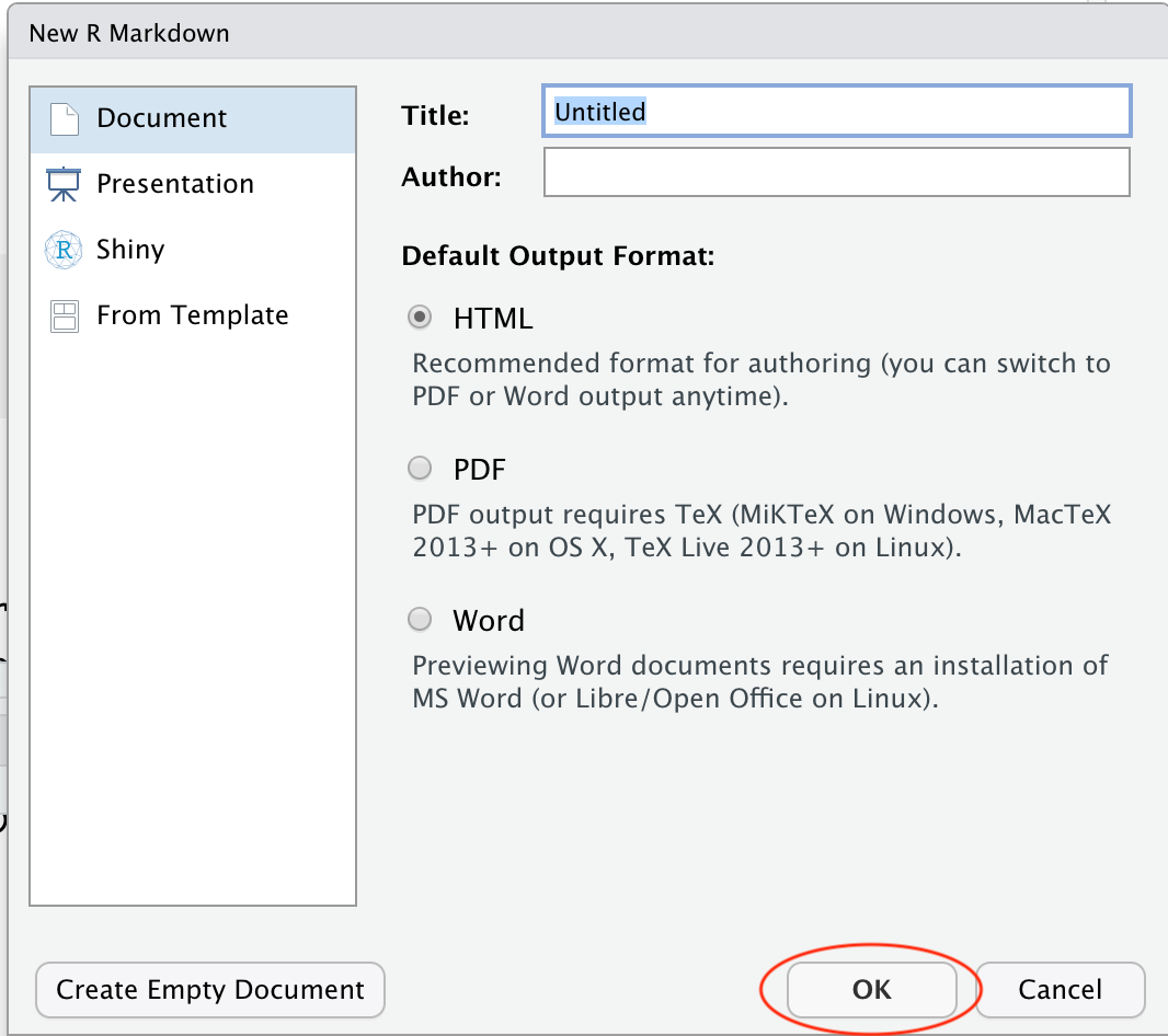 - 「New R Markdown」というウィンドウが出てくる。「Document」を選んで「OK」を選ぶ。Title(ドキュメントのタイトル)やAuthor(著者名)の情報を入力しても構わない。