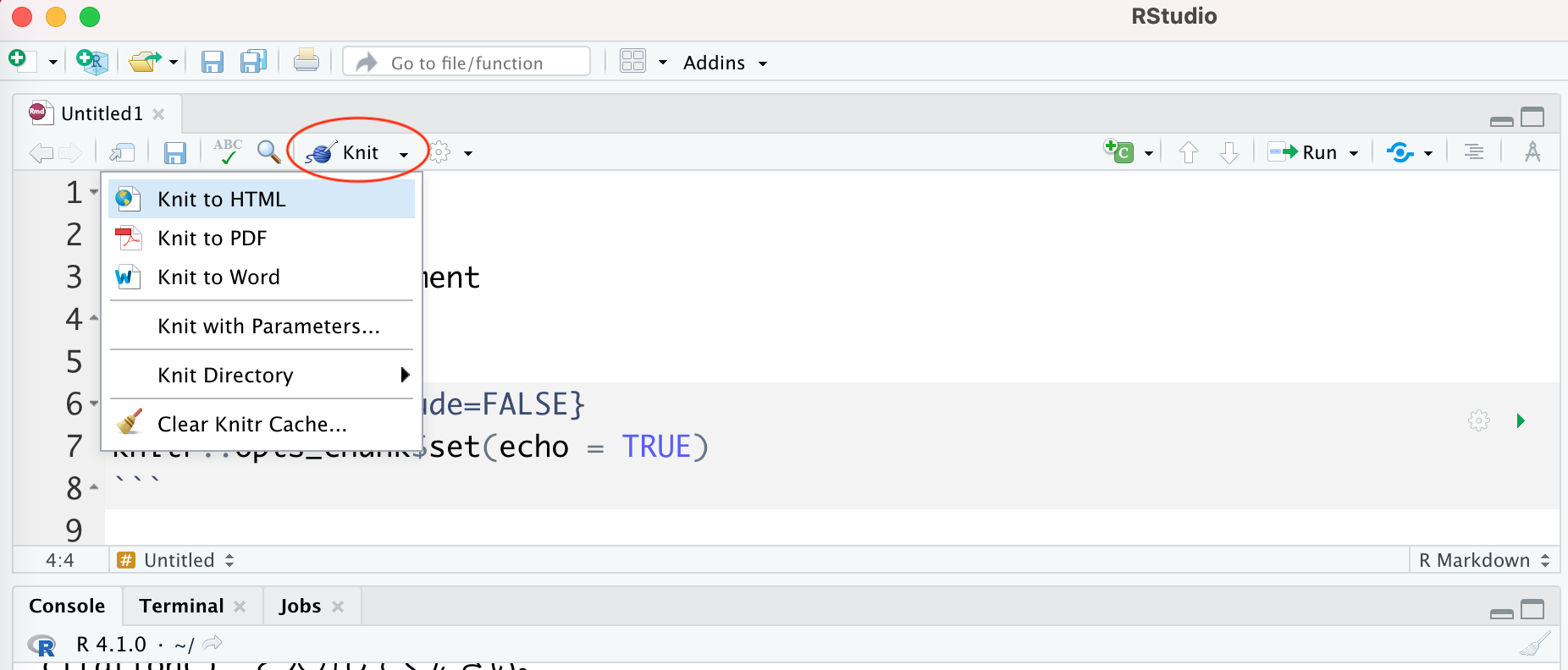 - 「Knit」のプルダウンから、「Knit to HTML」を選ぶ。