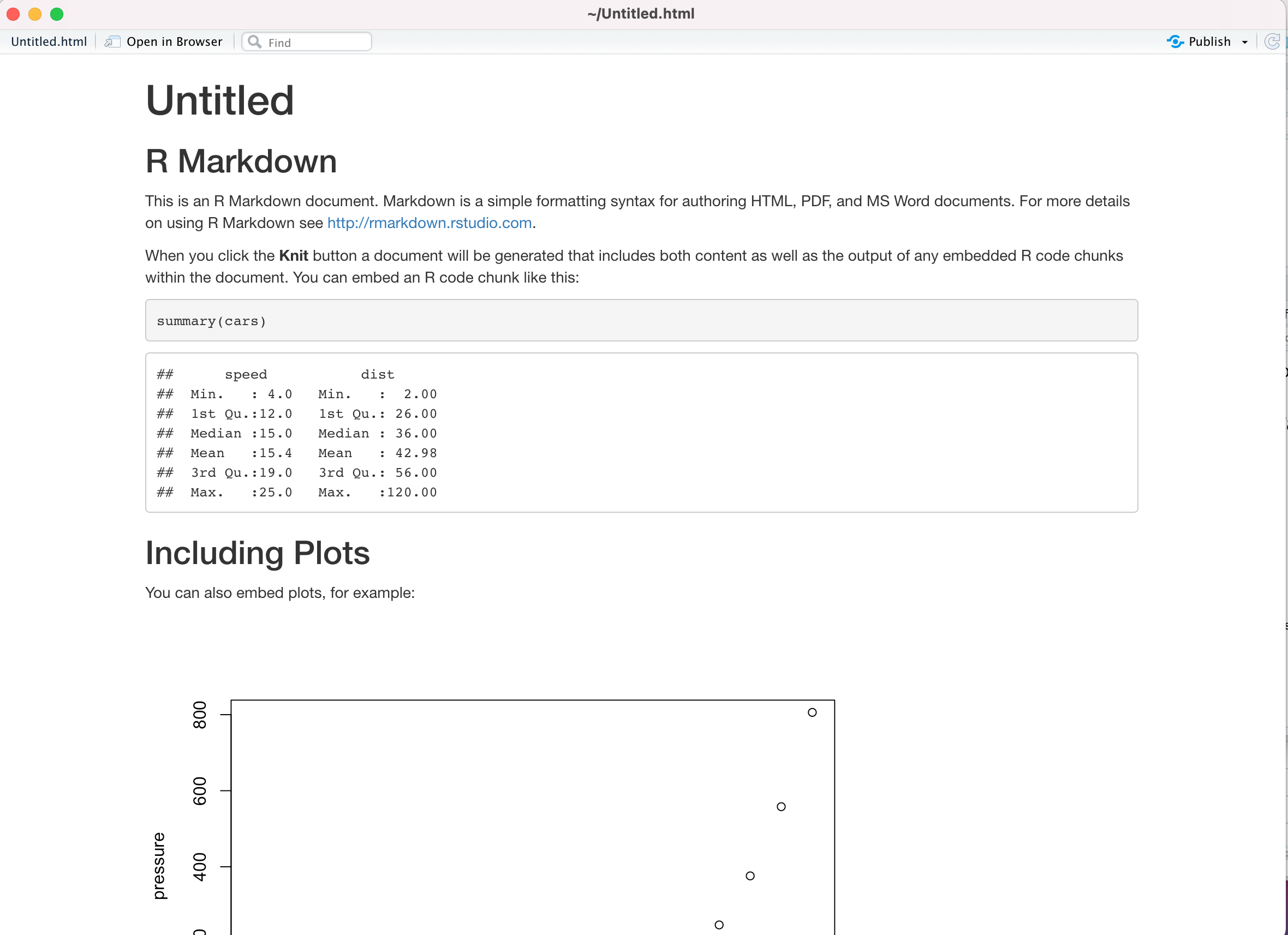 - R Markdownドキュメントがサンプルコードとともに表示される。